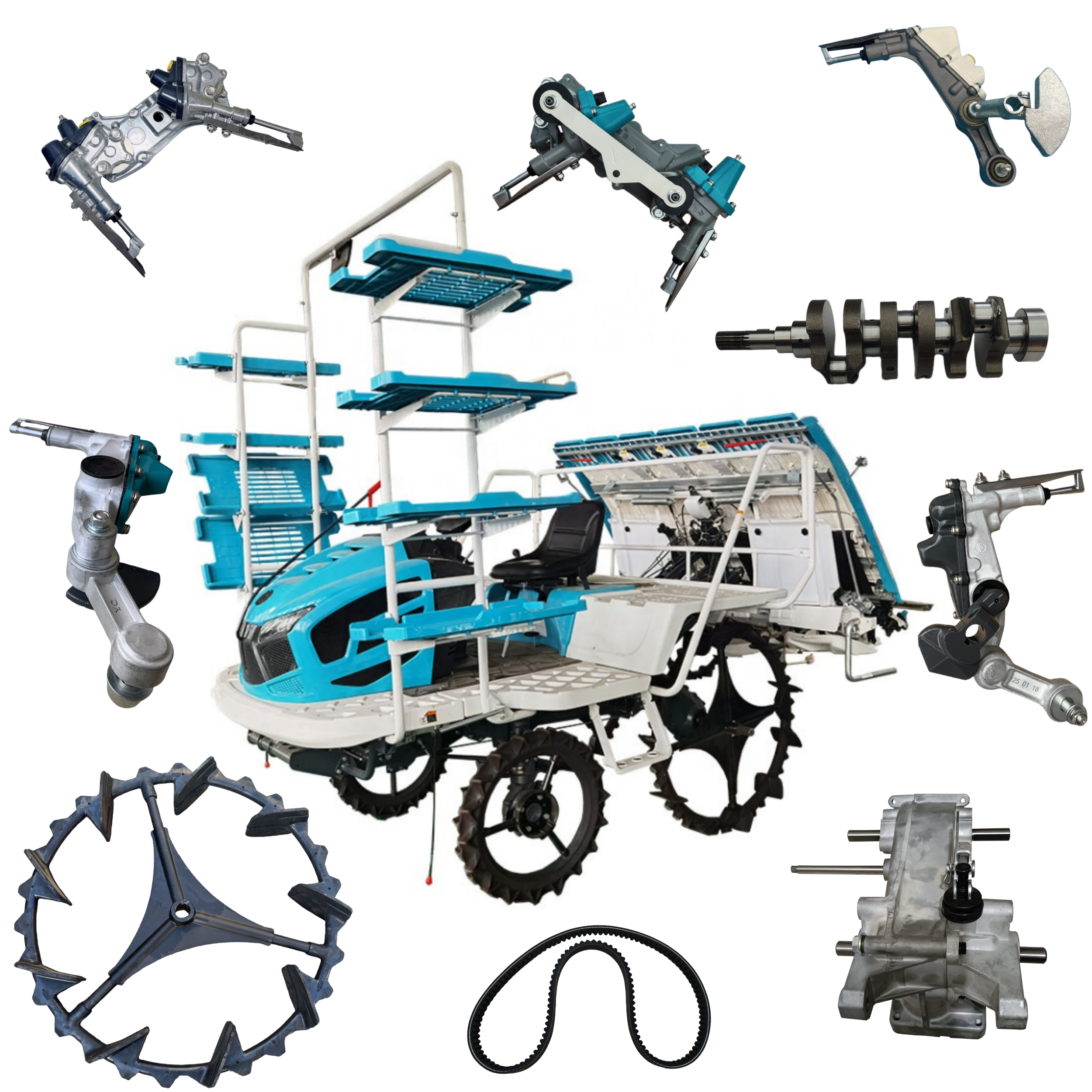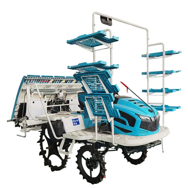 Rice transplanters are planting machines that plant rice seedlings in paddy fields, aiming to improve transplanting efficiency and quality. They are key equipment in agricultural mechanization. This machine adopts the principle of sequentially dividing and picking seedlings in groups. It consists of seedling boxes, transplanting mechanisms, and floats. The motorized version is equipped with a 2.2-3 kW internal combustion engine. The row spacing is adjustable, and the plant spacing is controlled by an adjustment device.